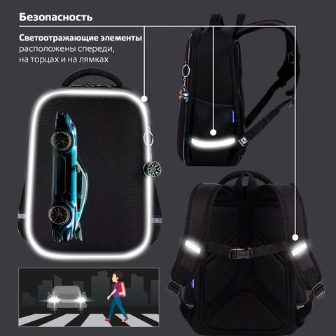 Светоотражающие элементы ранца расположены спереди, на торцах и на лямках. Они необходимы для безопасности пользователя в темное время суток.