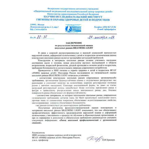 Ранцы BRAUBERG LIGHT протестированы НИИ гигиены и охраны здоровья детей и подростков ФГАУ "Национальный медицинский исследовательский центр здоровья детей". В рамках проведенных исследований* было установлено, что конструкции и материалы ученических ранцев соответствуют современным эргономическим требованиям и способствуют формированию здоровой осанки у школьников.