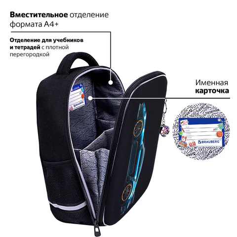 В отделении ранца формата А4+ можно легко и быстро разместить учебники и тетради, также в отделении есть плотная перегородка и именная карточка школьника. Ранец широко раскрывается, повышая удобство использования, а за счёт боковых перегородок содержимое не выскользнет из ранца.