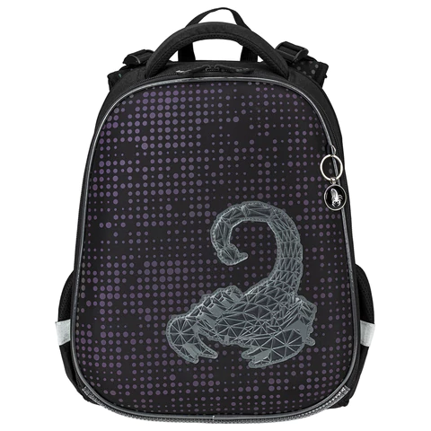 Дизайн передней панели ранца реализован с использованием уникального светоотражающего принта: при попадании искусственного света ранец переливается разноцветным свечением, тем самым привлекая внимание и повышая безопасность ребенка в темное время суток. Резиновая аппликация на передней панели и брелок дополняют дизайн ранца.