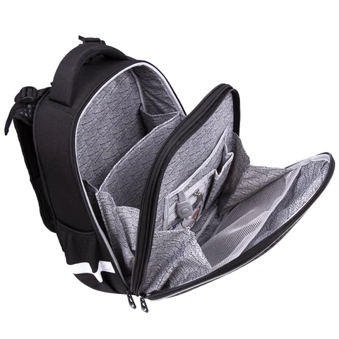 В основном отделении ранца можно легко и быстро разместить учебники. Внутри фронтального отделения находится органайзер для канцтоваров, именная карточка, карман для телефона, съёмный карабин для ключей и большое отделение из сетки. Такая организация пространства поможет держать принадлежности в сохранности и приучить ребенка к порядку. Ранец широко раскрывается, повышая удобство использования, а за счёт боковых перегородок содержимое не выскользнет из ранца.