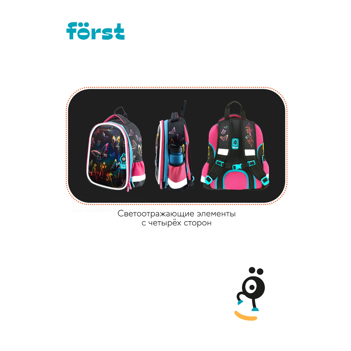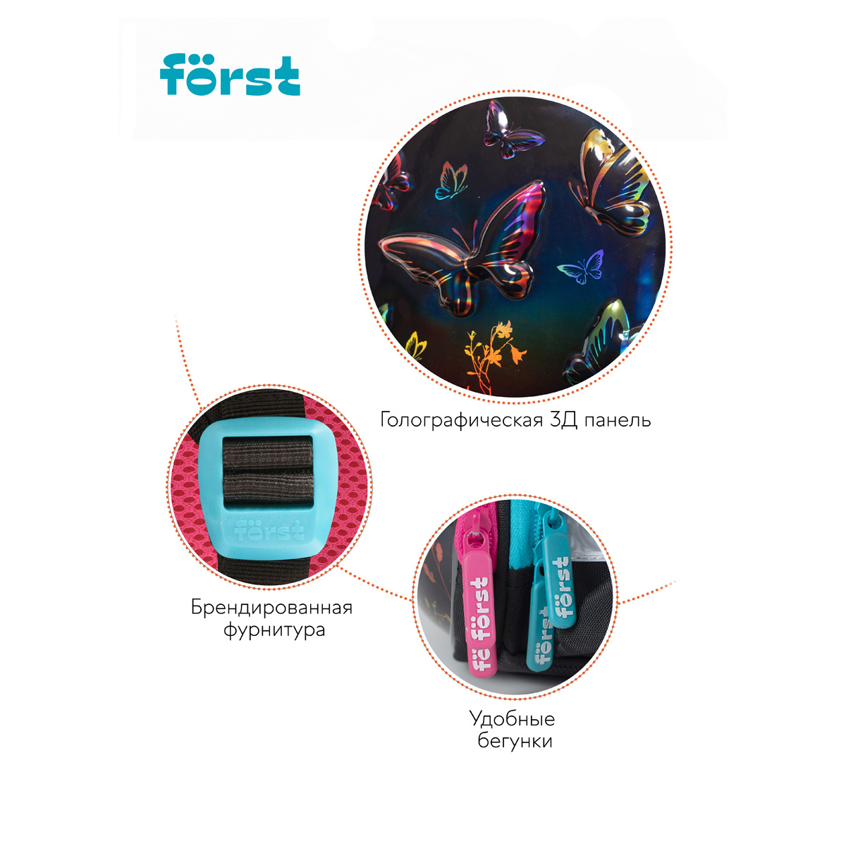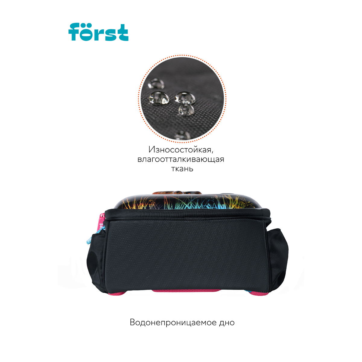 Ранец Först F-Glow Colors of nature размером 37*29,5*16 см и объемом 17,5 литра с двумя отделениями и двумя внешними карманами, органайзером, разделителями для учебников и тетрадей. Модели серии F-Glow имеют красочную голографическую 3D-панель. Ранец с правильной анатомической спинкой с мягкими спонжевыми подушечками, покрытыми вентиляционным материалом. Длина лямок регулируется в соответствии с ростом и комплекцией ребенка. Нагрудное крепление плотно фиксирует ранец, не дает лямкам спадать с плеч ребенка во время движения. Дно из водонепроницаемого материала и с пластиковыми ножками — для защиты содержимого от влаги и легкого ухода за изделием. Светоотражающие элементы обеспечивают безопасность в темное время суток. В подарок к ранцу — брелок. Кроме того, данная серия ранцев является облегченной и весит не более 850 г.