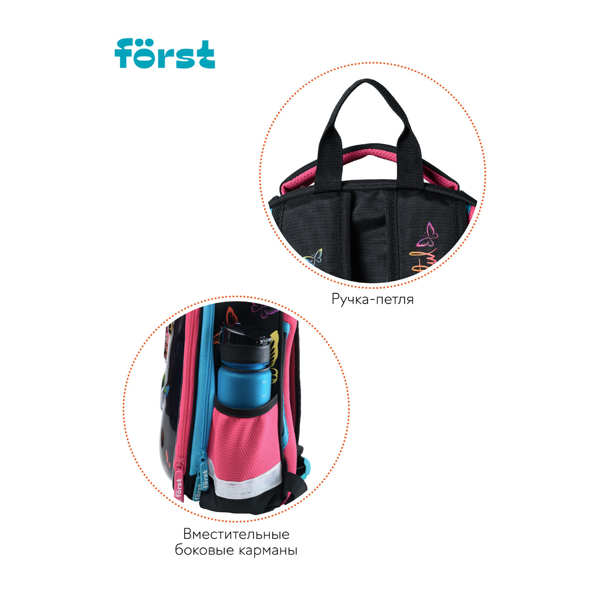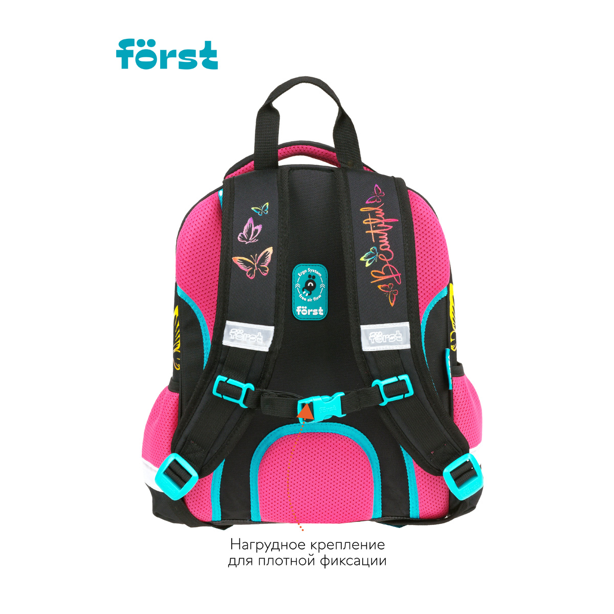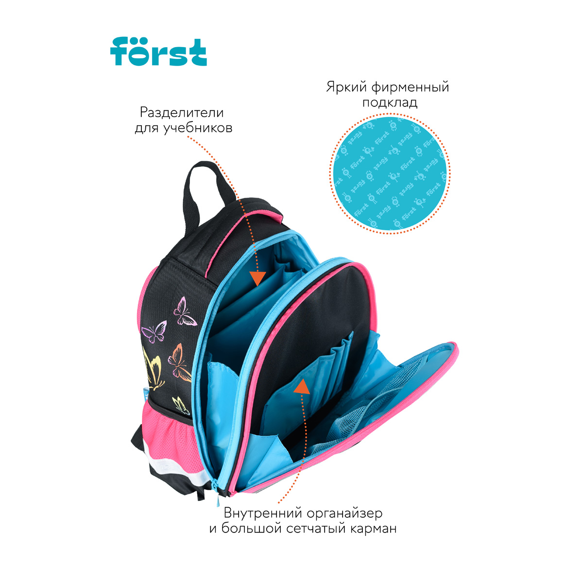 Ранец Först F-Glow Colors of nature размером 37*29,5*16 см и объемом 17,5 литра с двумя отделениями и двумя внешними карманами, органайзером, разделителями для учебников и тетрадей. Модели серии F-Glow имеют красочную голографическую 3D-панель. Ранец с правильной анатомической спинкой с мягкими спонжевыми подушечками, покрытыми вентиляционным материалом. Длина лямок регулируется в соответствии с ростом и комплекцией ребенка. Нагрудное крепление плотно фиксирует ранец, не дает лямкам спадать с плеч ребенка во время движения. Дно из водонепроницаемого материала и с пластиковыми ножками — для защиты содержимого от влаги и легкого ухода за изделием. Светоотражающие элементы обеспечивают безопасность в темное время суток. В подарок к ранцу — брелок. Кроме того, данная серия ранцев является облегченной и весит не более 850 г.