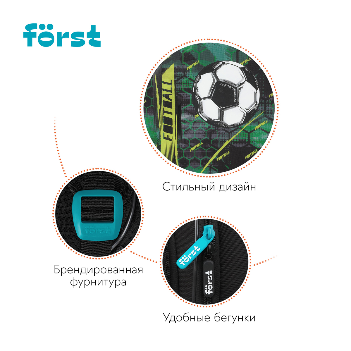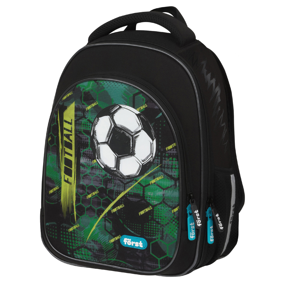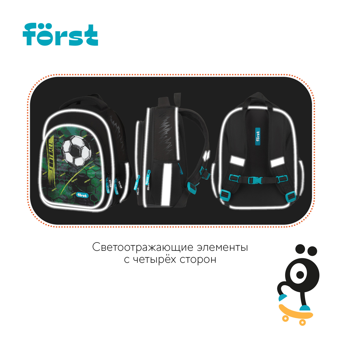 Ранец Först F-Light размером 36*27*15 см и объемом 14,6 литров с двумя отделениями и двумя внешними карманами, разделителями для учебников и тетрадей, внутренним карманом. Передняя часть и спинка ранца жесткие, а боковые панели уплотнены слоем спонжа. Благодаря анатомической вентилируемой спинке, а также регулируемым по длине лямкам и нагрудному креплению, он плотно фиксируется на спине ребенка. Дно — из водонепроницаемого материала для защиты от влаги. Ранец с плотной ручкой и петлей для подвешивания. Световозвращающие элементы на передней части, сбоку и на лямках обеспечивают безопасность ребенка в темное время суток.