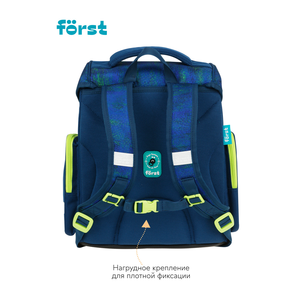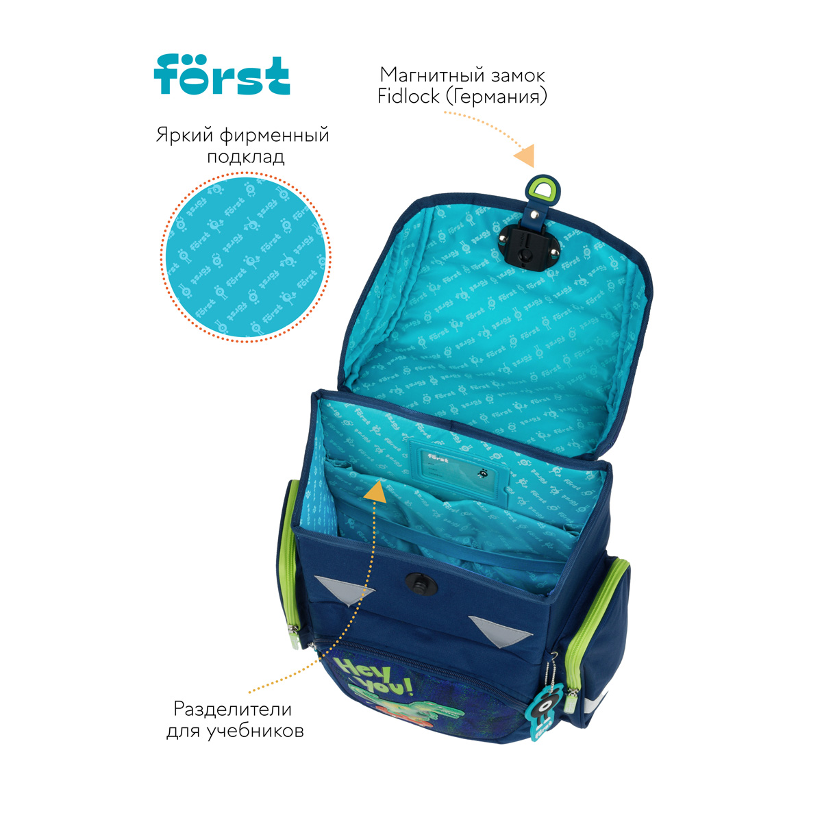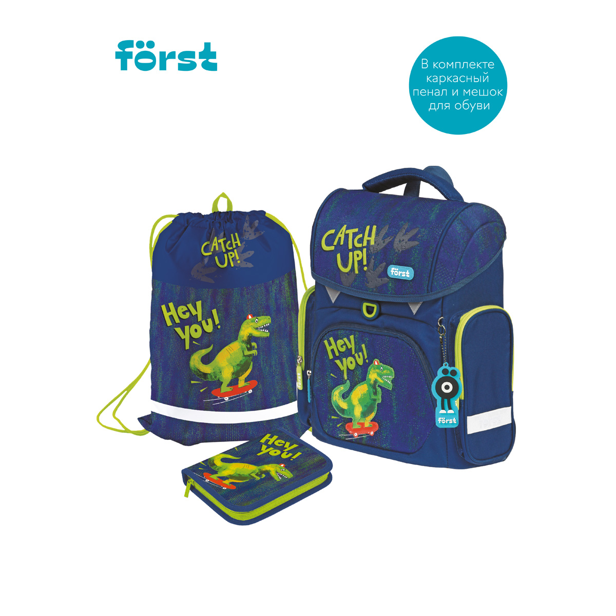 Ранец школьный для мальчика Först F-Set “Catch up” размером 35*29*16 см и объемом 16,2 литра с одним отделением, тремя карманами. В комплекте с ним идут каркасный пенал-книжка и мешок для обуви. Школьные ранцы серии F-Set — это комбинация классики формы и новых технологий в исполнении. Ранец имеет правильную анатомическую спинку из вентиляционного материала высокого качества с мягкими спонжевыми подушечками. Она предотвращает натирание спины и плеч ребенка. Ранец застегивается на надежный и удобный магнитный замок немецкой фирмы Fidlock, который уже зарекомендовал себя на рынке европейской текстильной продукции.
