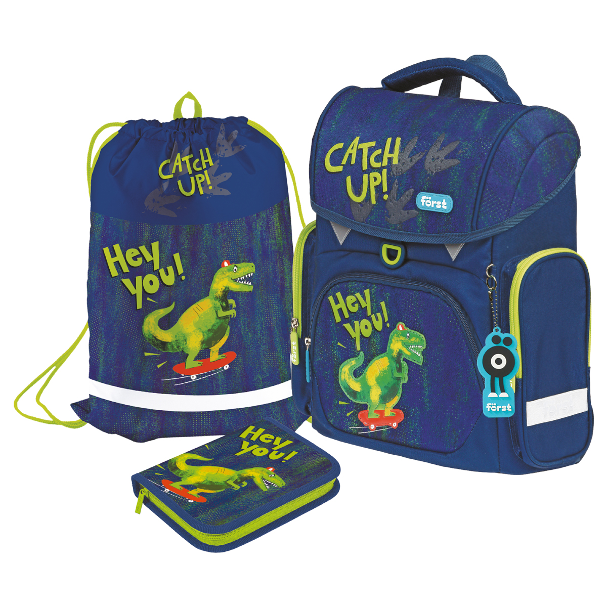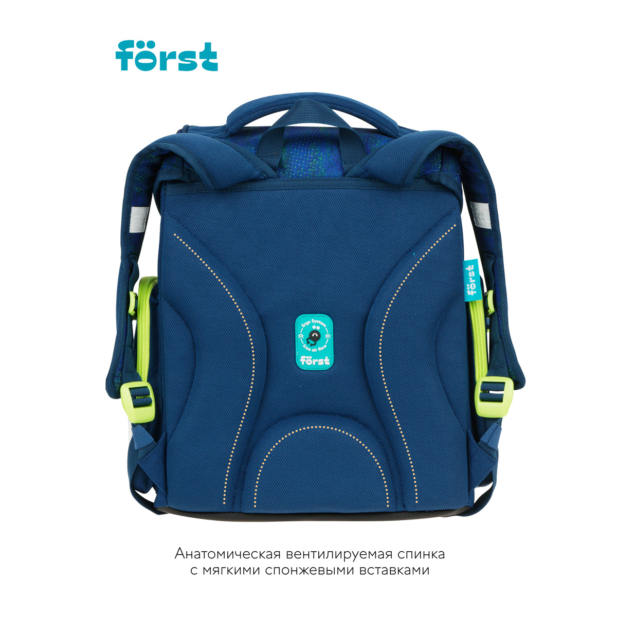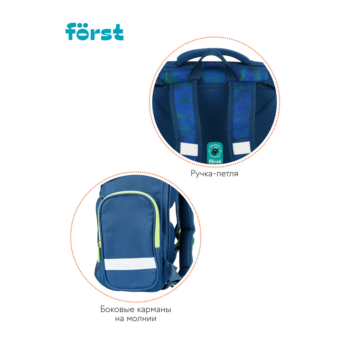 Ранец школьный для мальчика Först F-Set “Catch up” размером 35*29*16 см и объемом 16,2 литра с одним отделением, тремя карманами. В комплекте с ним идут каркасный пенал-книжка и мешок для обуви. Школьные ранцы серии F-Set — это комбинация классики формы и новых технологий в исполнении. Ранец имеет правильную анатомическую спинку из вентиляционного материала высокого качества с мягкими спонжевыми подушечками. Она предотвращает натирание спины и плеч ребенка. Ранец застегивается на надежный и удобный магнитный замок немецкой фирмы Fidlock, который уже зарекомендовал себя на рынке европейской текстильной продукции.