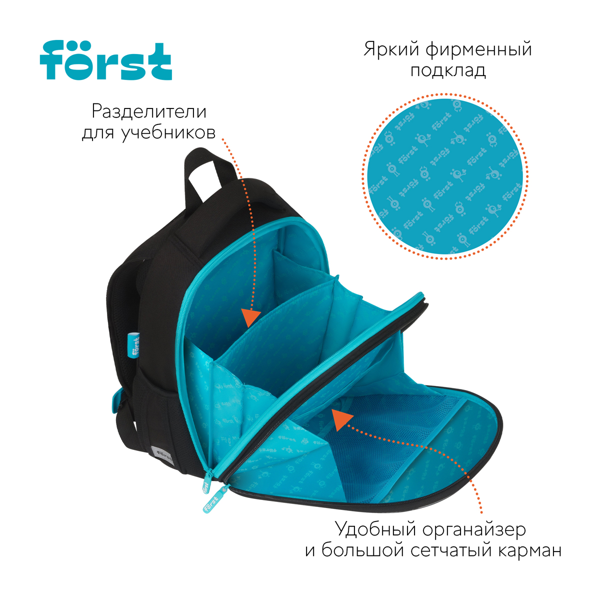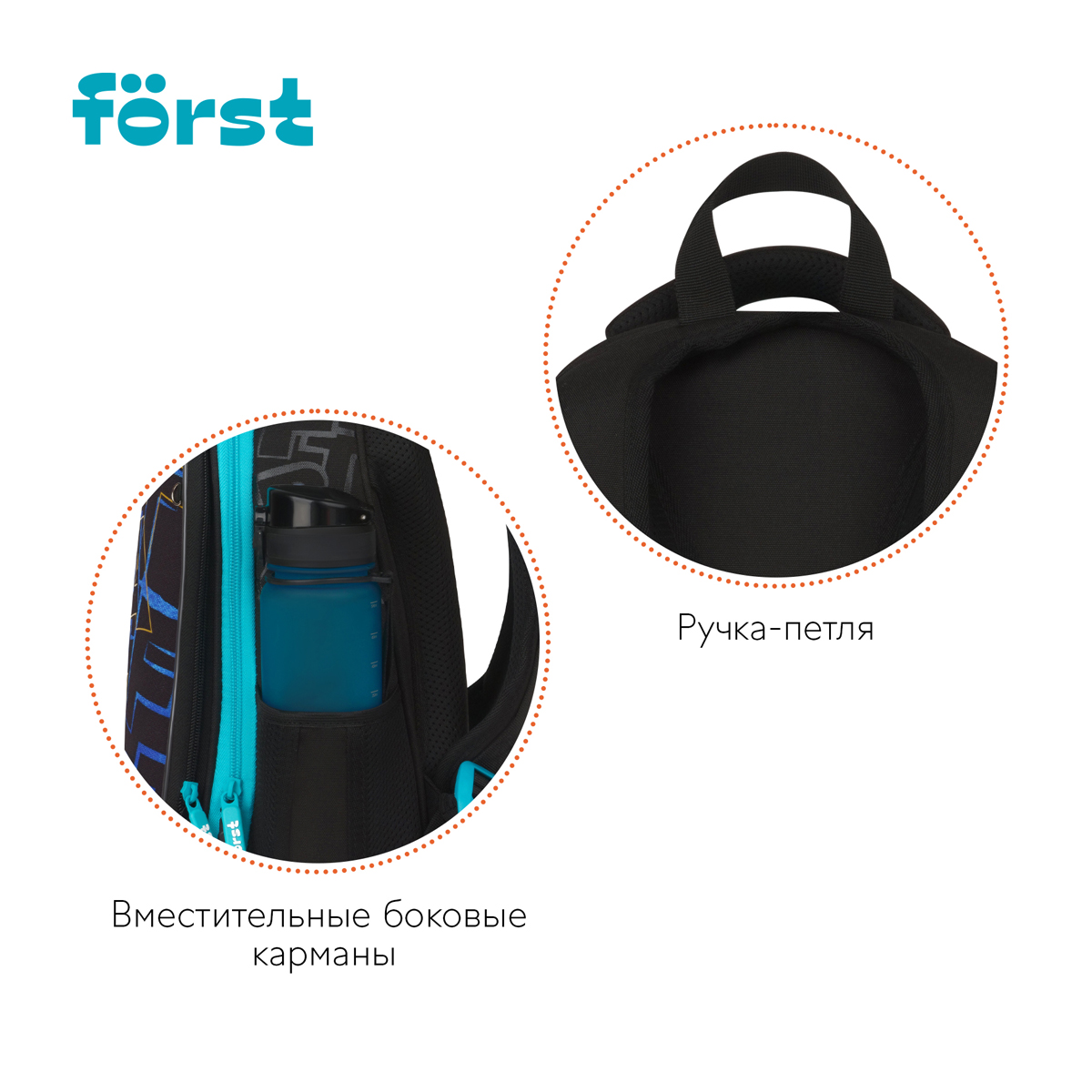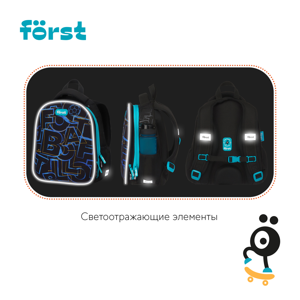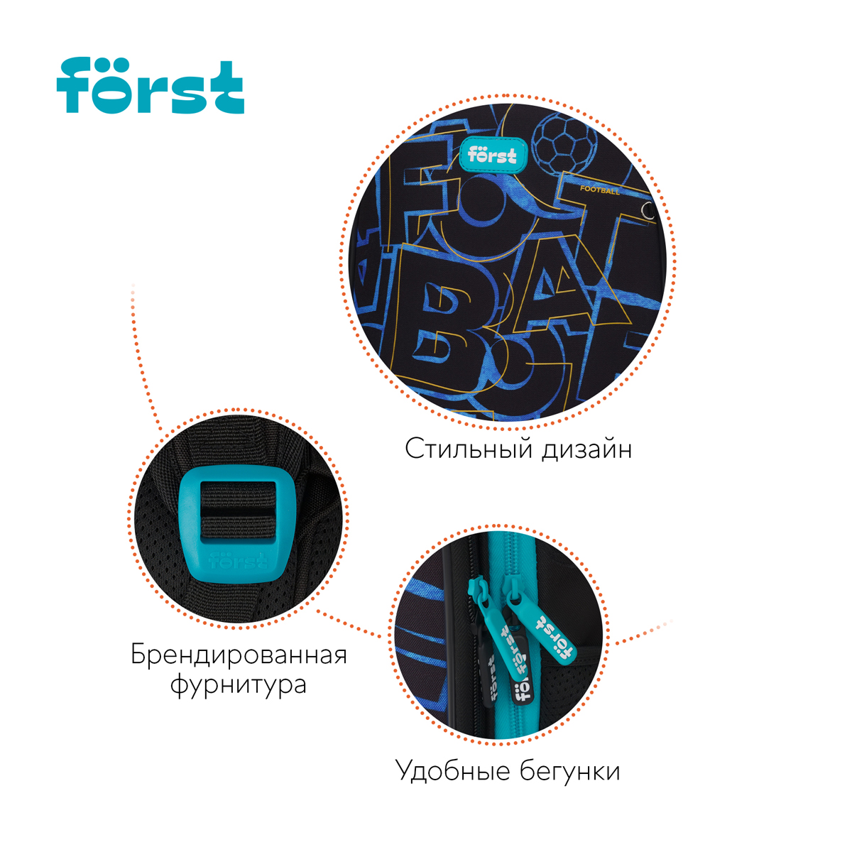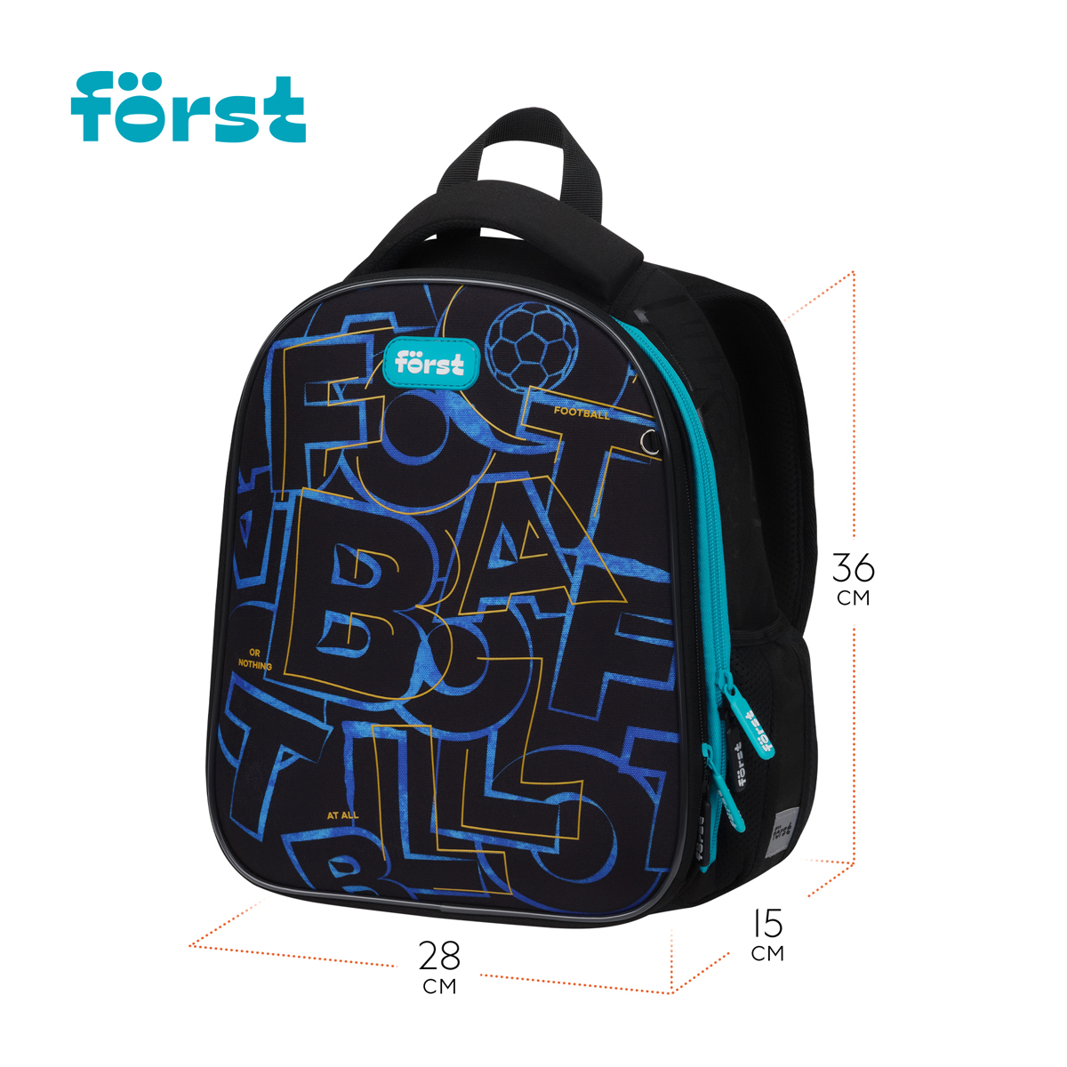 Эргономичный ранец Först серии F-Top "Football" рассчитан на учеников младшей и средней школы. В нём предусмотрены 2 отделения с разделителями для тетрадей, 2 боковых кармана и внутренний органайзер. Оснащён эргономичными регулируемыми лямками и уплотнёнными боковинками. Облегчённый ранец весит 800 г. Размер — 36*28*15 см.