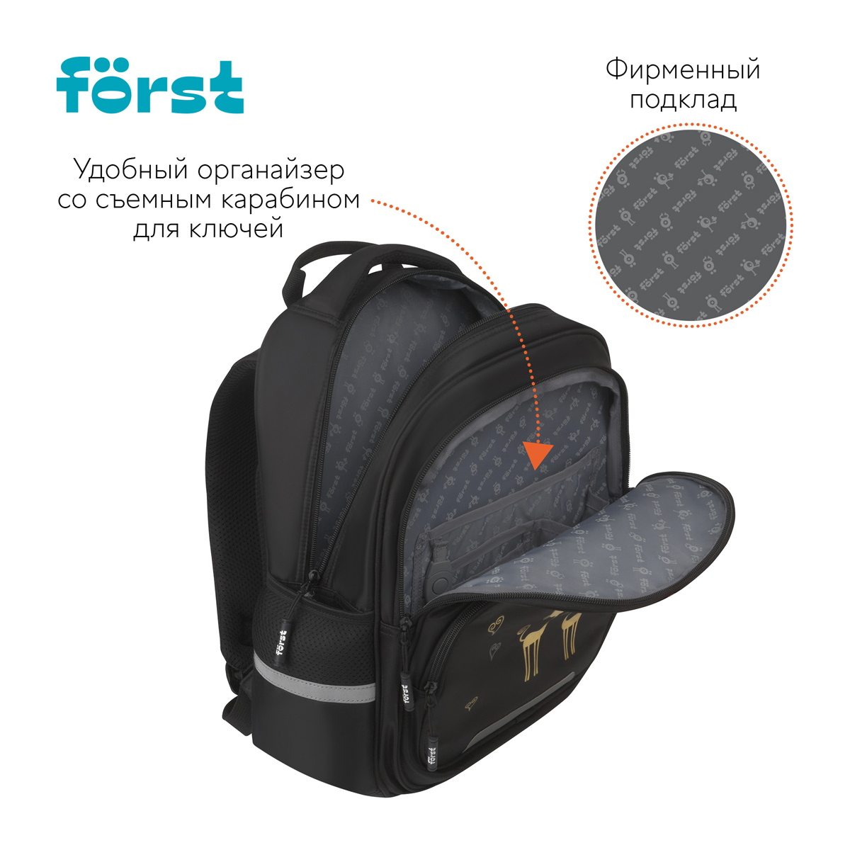 Рюкзак Först серии F-Comfy Best friends — отличный выбор для детей младшего и среднего школьного возраста. Имеет два отделения и три кармана, в которые поместится всё необходимое. Размер — 38*29*15 см. Внутри — органайзер для канцтоваров и съемный карабин для ключей. Рюкзак сделан из высококачественного твила — износостойкого материала. Модель весит не более 750 граммов и вмещает до 16,5 литров. Жесткая эргономичная спинка равномерно распределяет нагрузку без вреда для осанки. Спонжевые вставки, покрытые мягким вентиляционным материалом, обеспечивают комфорт, а также предотвращают запотевание спины ребенка. Нагрудное крепление плотно фиксирует рюкзак, не дает лямкам спадать с плеч во время движения. Высота крепления регулируется. Дно рюкзака покрыто водонепроницаемым материалом для защиты содержимого от влаги и легкого ухода за изделием. На изделии есть светоотражающие элементы — для безопасного движения ребёнка в тёмное время суток. Рюкзак закрывается на пластиковую молнию с удобными бегунками. Изделие упаковано в пакет.