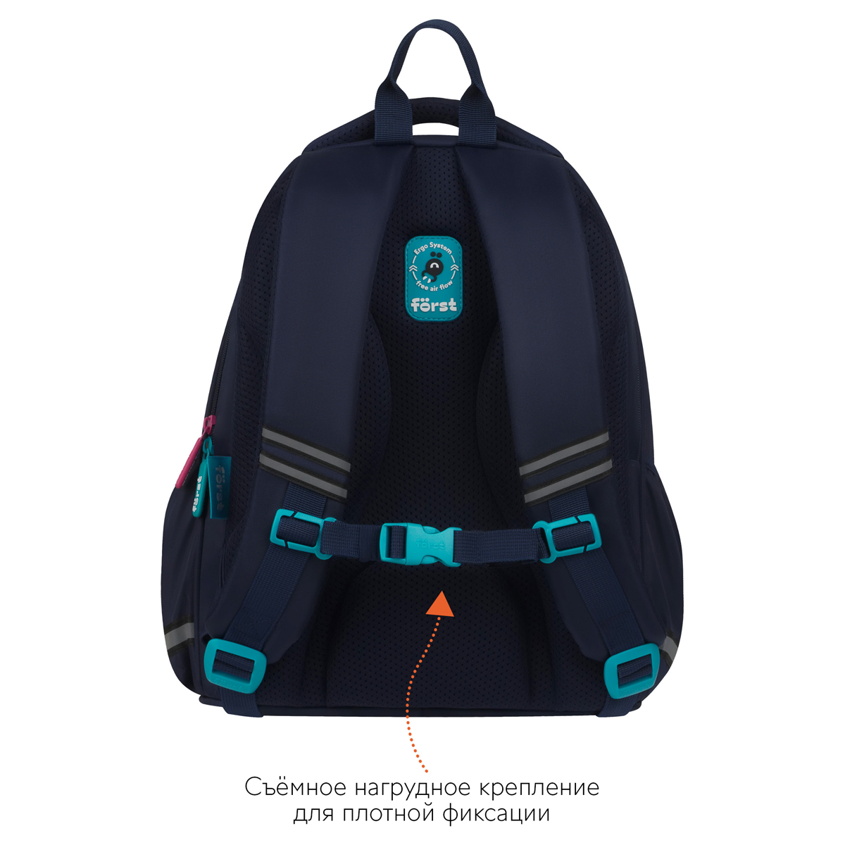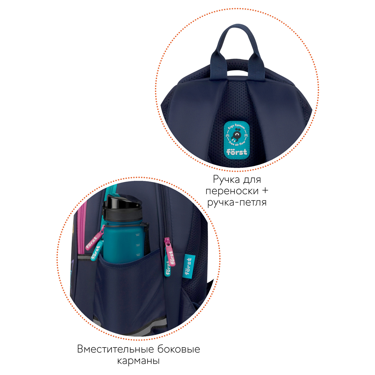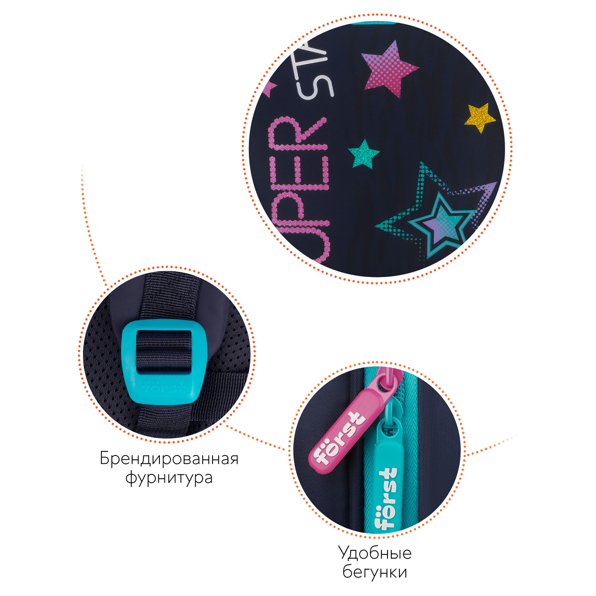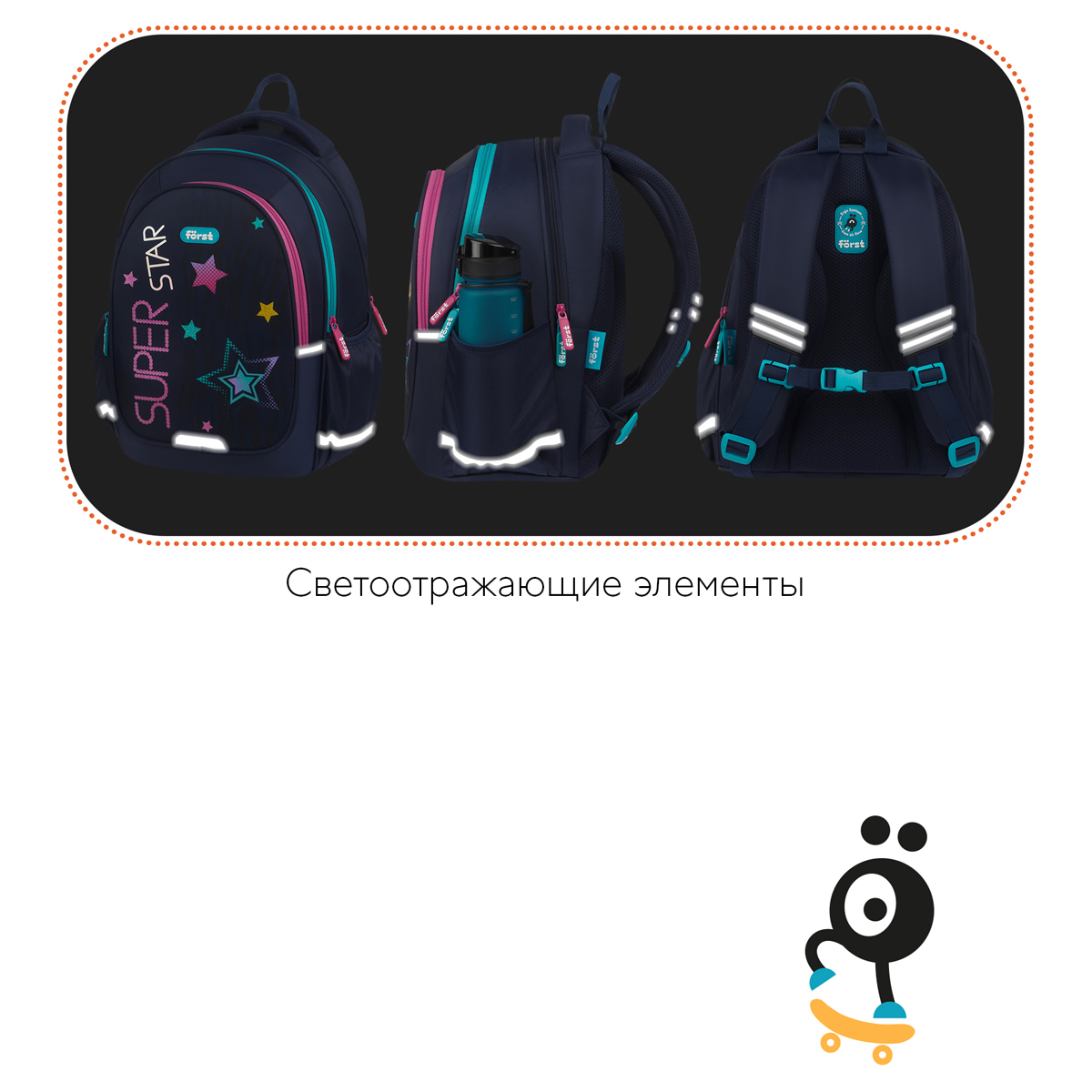 Рюкзак Först серии F-Cute Super star — отличный выбор для детей младшего и среднего школьного возраста. Имеет три отделения и два кармана. В него поместится всё необходимое. Размер — 37*29*17 см. Внутри — разделители для учебников, органайзер и съемный карабин для ключей. Рюкзак сделан из высококачественного твила — износостойкого материала. Модель весит не более 720 граммов и вмещает до 18 литров. Жесткая эргономичная спинка равномерно распределяет нагрузку без вреда для осанки. Внешнее покрытие спинки — мягкий вентиляционный материал премиального качества обеспечивает комфорт, а также предотвращает запотевание спины ребенка. Нагрудное крепление плотно фиксирует рюкзак, не дает лямкам спадать с плеч во время движения. Высота крепления регулируется. Дно рюкзака покрыто водонепроницаемым материалом для защиты содержимого от влаги и легкого ухода за изделием. Светоотражающие элементы — для безопасного передвижения ребенка в темное время суток. Рюкзак закрывается на пластиковую молнию с удобными бегунками. Изделие упаковано в пакет.