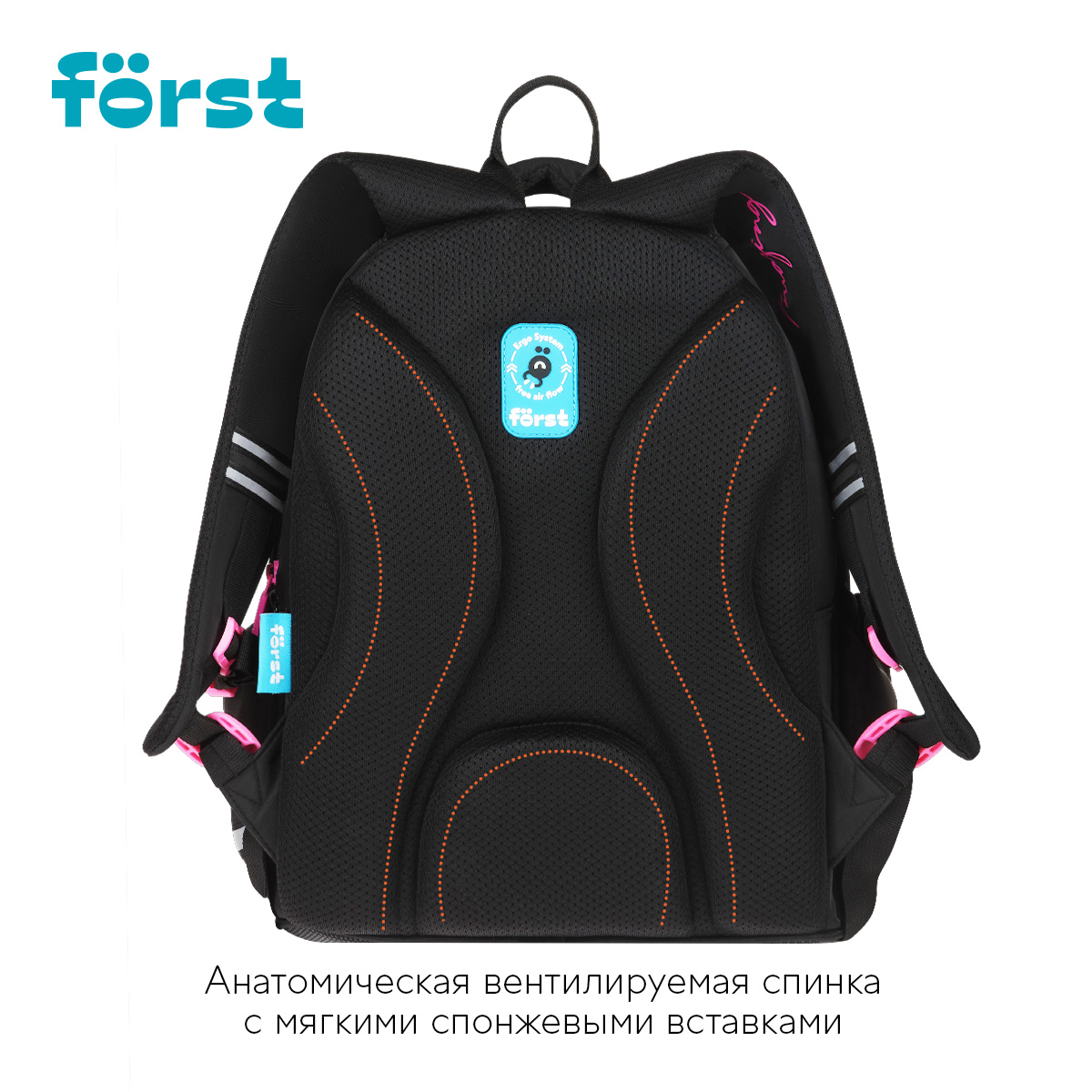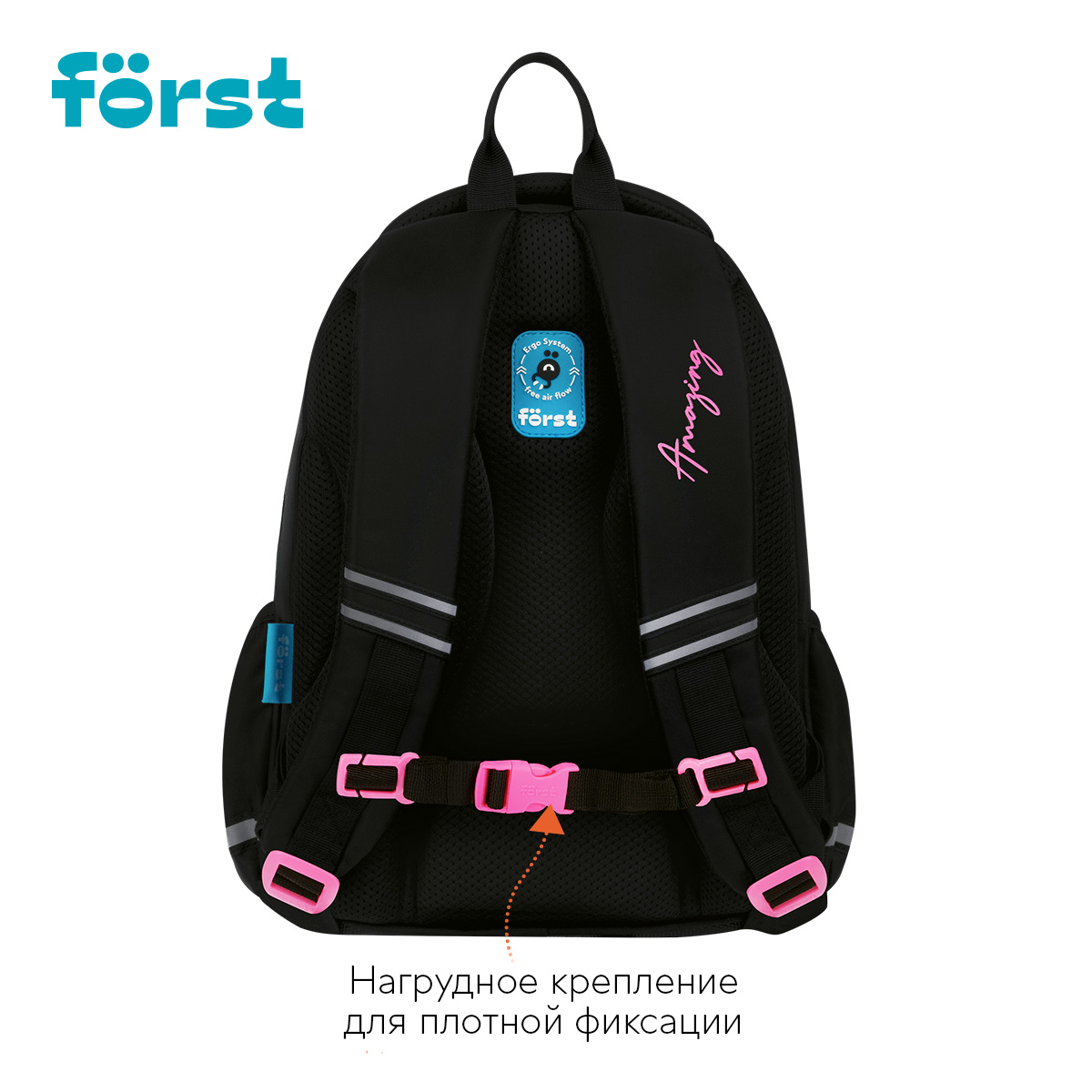 Рюкзак с жесткой анатомической спинкой Först F-Cute размером 37*29*17 см и объёмом 18 литров с тремя отделениями, двумя карманами для детей младшего и среднего школьного возраста. Внутри — разделители для учебников, органайзер и съемный карабин для ключей. Жесткая эргономичная спинка равномерно распределяет нагрузку без вреда для осанки. Внешнее покрытие спинки — мягкий вентиляционный материал премиального качества обеспечивает комфорт, а также предотвращает запотевание спины ребенка. Нагрудное крепление плотно фиксирует рюкзак, не дает лямкам спадать с плеч во время движения. Высота крепления регулируется. Дно рюкзака покрыто водонепроницаемым материалом для защиты содержимого от влаги и легкого ухода за изделием. Светоотражающие элементы — для безопасного передвижения ребенка в темное время суток.