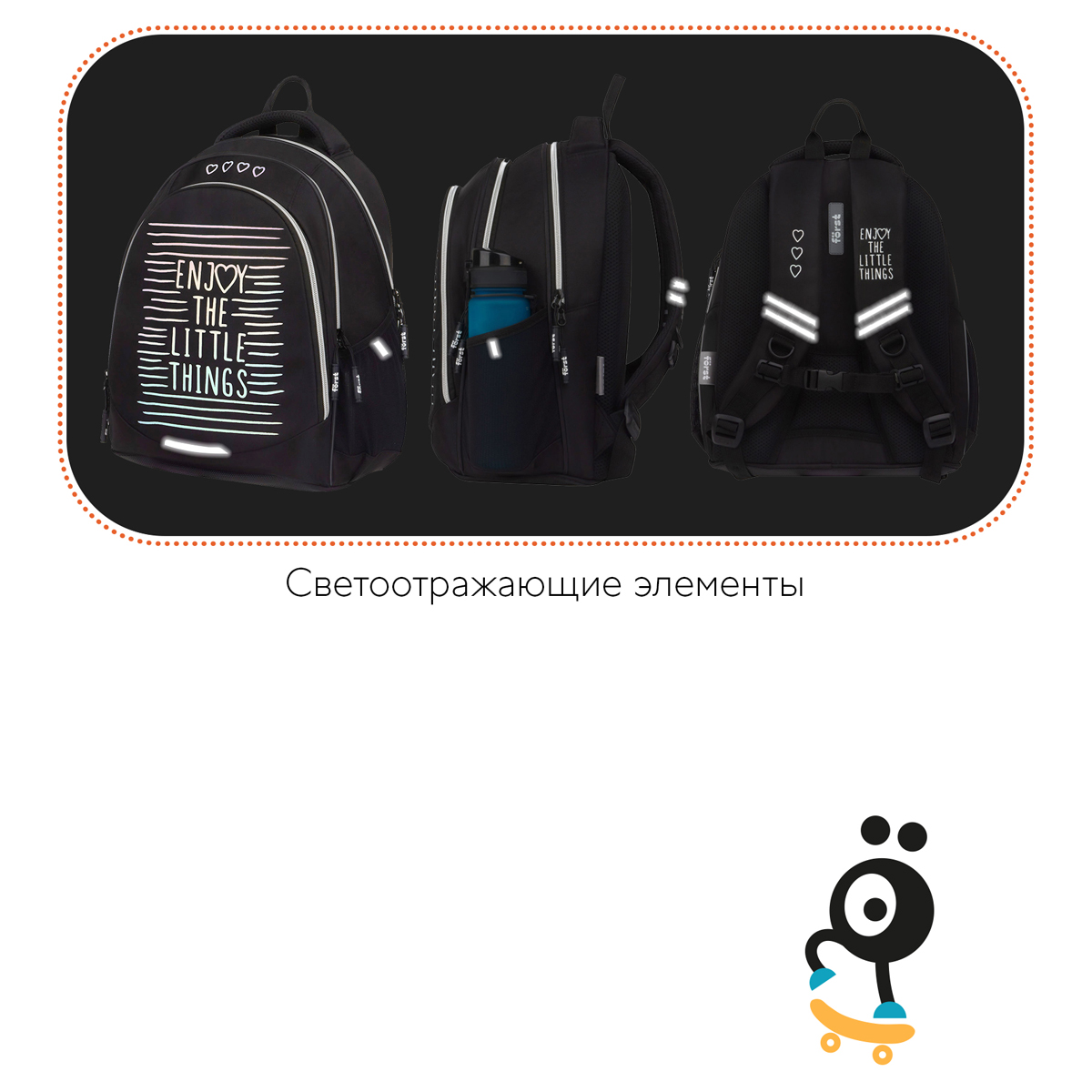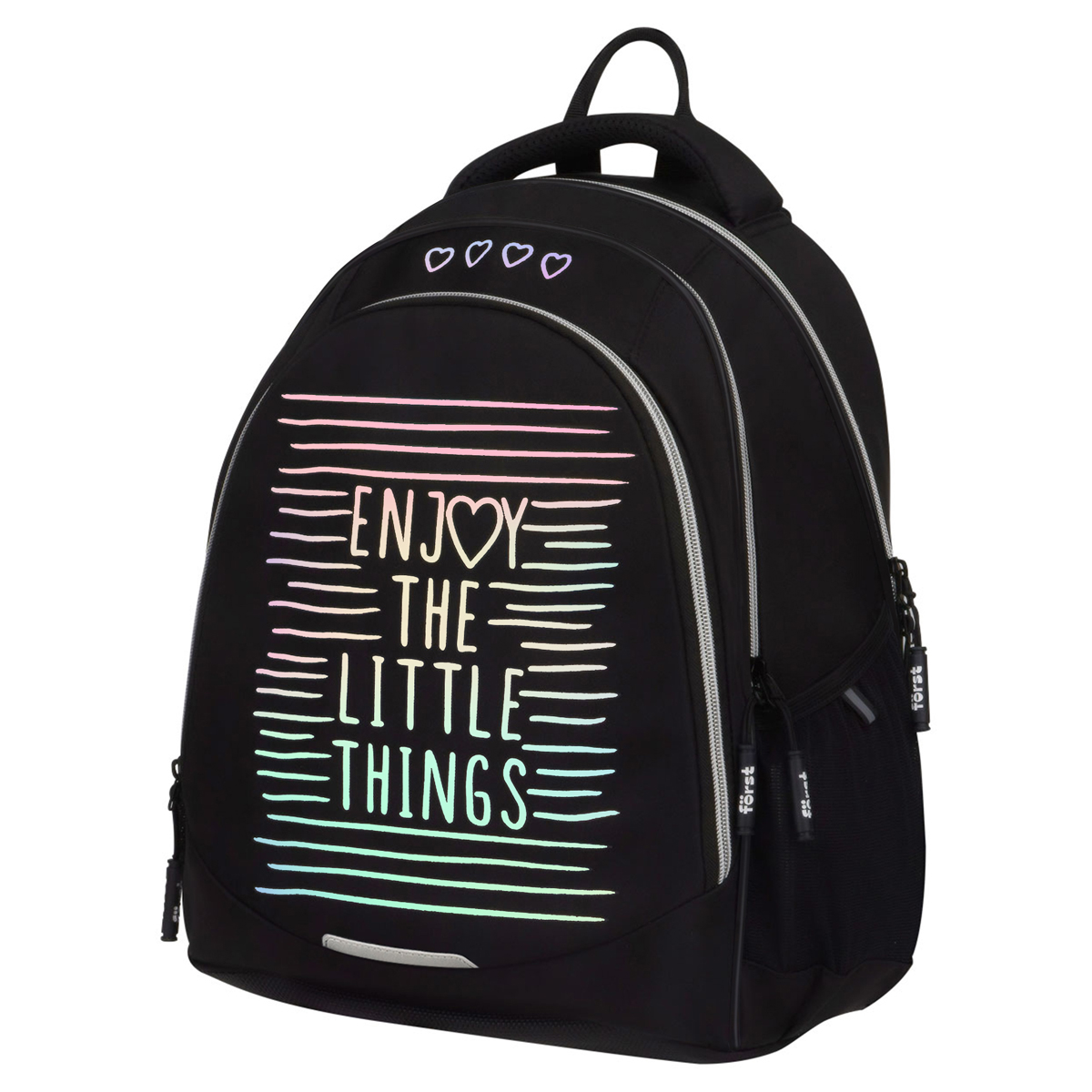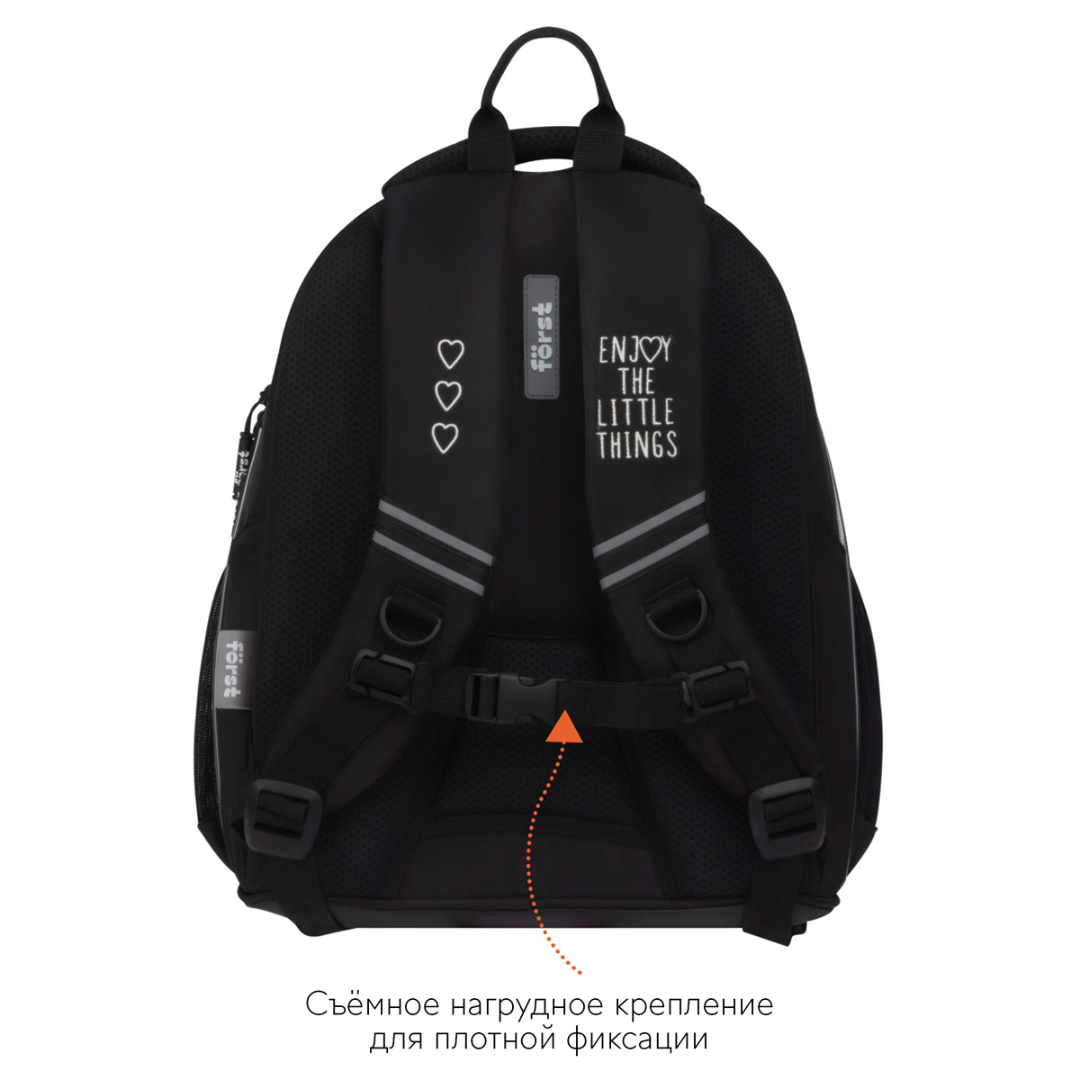 Рюкзак с жесткой анатомической спинкой Först F-JUNIOR размером 38*29*18 см и объёмом 20 литров с тремя отделениями, двумя карманами предназначен для детей среднего и старшего школьного возраста. В рюкзаке предусмотрены внутренние карманы, органайзер для канцтоваров и съемный карабин для ключей. Жесткая эргономичная спинка равномерно распределяет нагрузку без вреда для осанки. Спонжевые вставки, покрытые мягким вентиляционным материалом, обеспечивают комфорт, а также предотвращают запотевание спины ребенка. Нагрудное крепление плотно фиксирует рюкзак, не дает лямкам спадать с плеч во время движения. Высота крепления регулируется. Усиленное дно, плотная ручка и петля для подвешивания делают рюкзак максимально удобным.