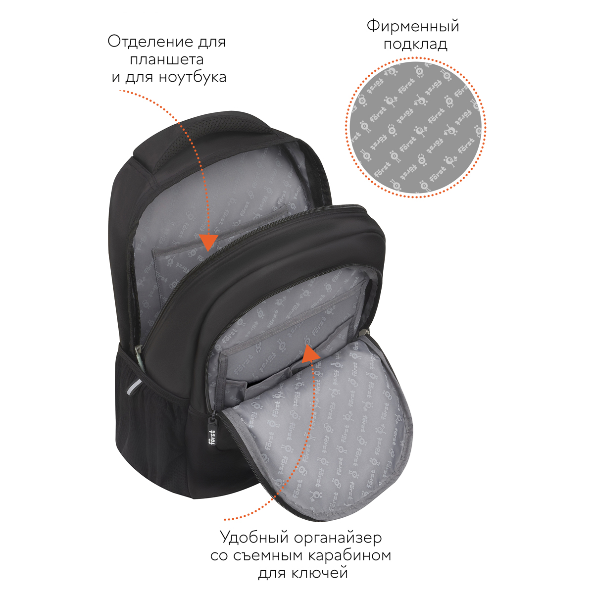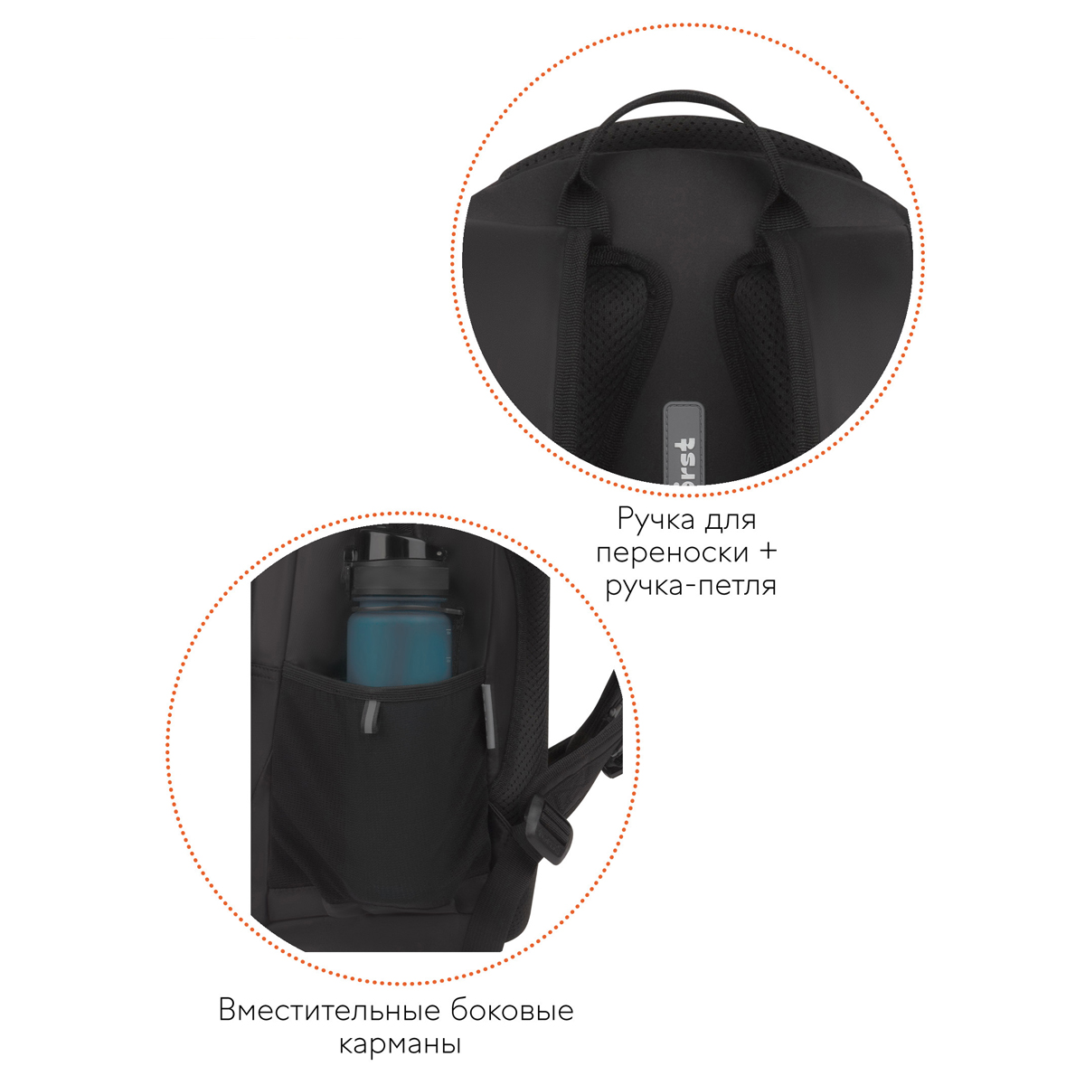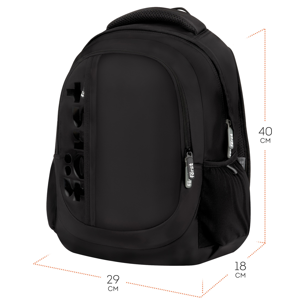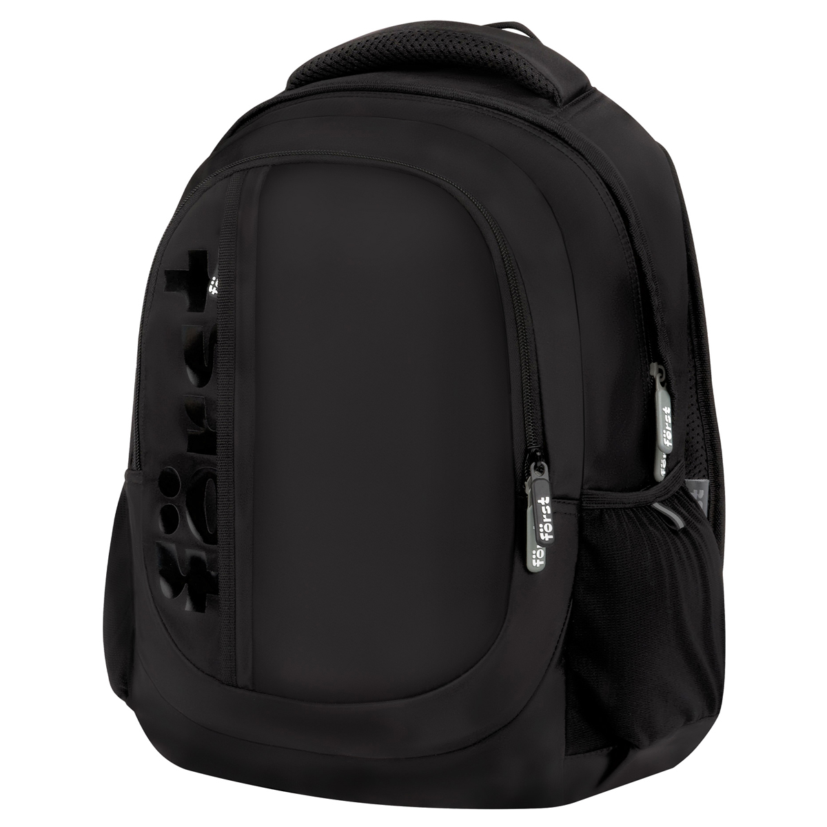 Рюкзак Först серии F-Trend Pure black — выбор активных молодых людей. Имеет два больших отделения и три кармана: один на молнии и два боковых. В него поместится всё необходимое. Размер — 40*29*18 см. Внутри есть мягкое отделение для планшета и органайзер для канцтоваров. Рюкзак сделан из высококачественного твила — износостойкого материала. Модель весит не более 630 граммов и вмещает до 20,9 литров. Жесткая анатомическая спинка равномерно распределяет нагрузку без вреда для осанки. Спонжевые вставки, покрытые мягким вентиляционным материалом, обеспечивают комфорт, а также предотвращают запотевание спины ребенка. Нагрудное крепление плотно фиксирует рюкзак, не дает лямкам спадать с плеч во время движения. Высота крепления регулируется. Рюкзак закрывается на пластиковую молнию с удобными бегунками. Благодаря минималистичному дизайну он органично сочетается с классическими, повседневными и спортивными образами. Изделие упаковано в пакет.