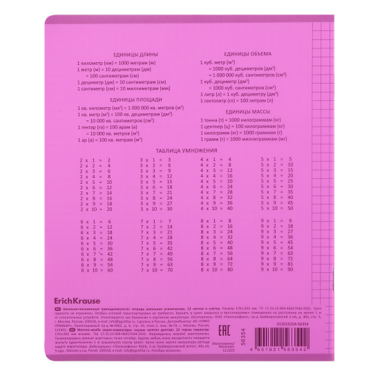 Тетрадь школьная ученическая формата А5+ (170x203 мм). Двойная обложка: внешняя выполнена из высококачественного износостойкого цветного пластика с фактурой «апельсиновая корка», внутренняя — из офсетной бумаги. В блоке 12 листов в клетку. Бумага офсетная плотностью 60 г/м2. Цвет линовки — синий. Скругленные уголки обложки и блока. Тип скрепления — скоба. Тетради упакованы в термоусадочную пленку по 10 штук.