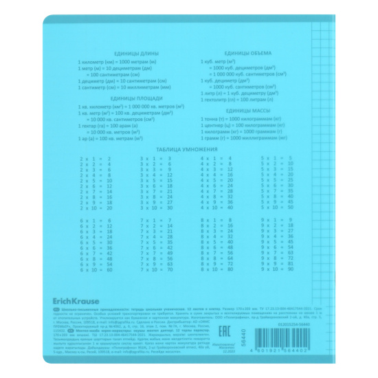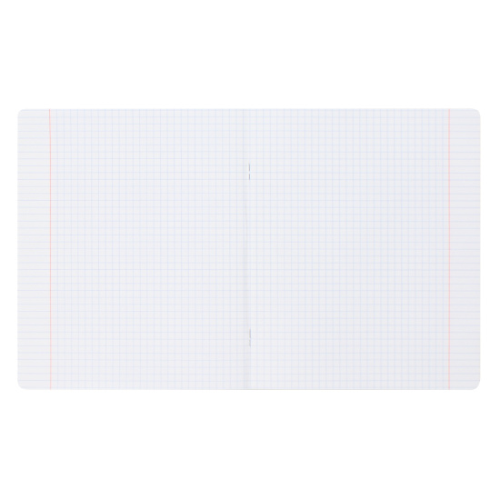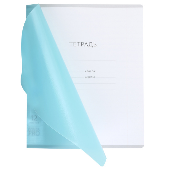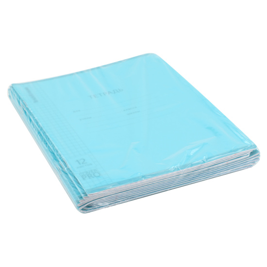 Тетрадь школьная ученическая формата А5+ (170x203 мм). Двойная обложка: внешняя выполнена из высококачественного износостойкого цветного пластика с фактурой «апельсиновая корка», внутренняя — из офсетной бумаги. В блоке 12 листов в клетку. Бумага офсетная плотностью 60 г/м2. Цвет линовки — синий. Скругленные уголки обложки и блока. Тип скрепления — скоба. Тетради упакованы в термоусадочную пленку по 10 штук.