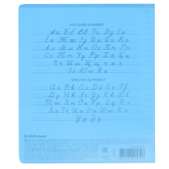 Тетрадь школьная ученическая формата А5+ (170x203 мм). Двойная обложка: внешняя выполнена из высококачественного износостойкого цветного пластика с фактурой «апельсиновая корка», внутренняя — из офсетной бумаги. В блоке 12 листов в линейку. Бумага офсетная плотностью 60 г/м2. Цвет линовки — синий. Скругленные уголки обложки и блока. Тип скрепления — скоба. Тетради упакованы в термоусадочную пленку по 10 штук.