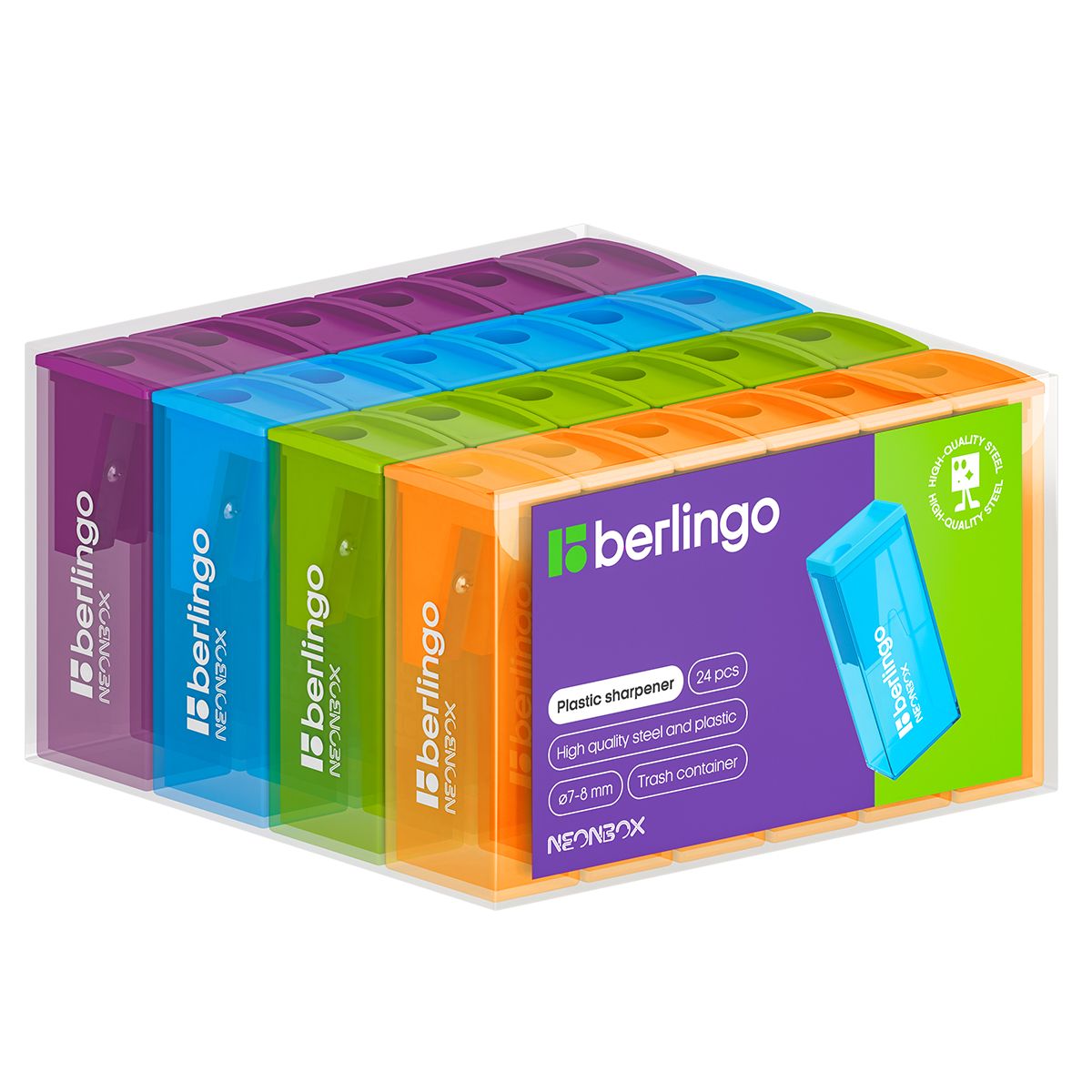 Точилка пластиковая , 1 отверстие. Яркие неоновые цвета крышки и контейнера. Позволяет легко и аккуратно производить заточку карандашей стандартного диаметра до 8 мм. Лезвия изготовлены из высококачественной стали для безупречной заточки карандашей. Упаковка – ассорти в картонный пенал по 24 шт.
