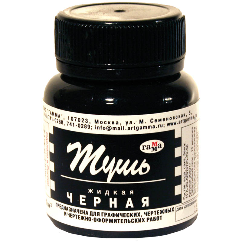 Тушь «ГАММА» для графических, чертёжных, чертёжно-оформительских работ и каллиграфии. Объём: 70 мл. Сочетает яркость цветов и чёткость линий. Оптимальная вязкость, лёгкость и удобство набора туши на рапидограф или рейсфедер. Устойчива к действию воды – достаточно промокнуть чертёж и тушь не растечется. Выдерживает температуру до −25°C.