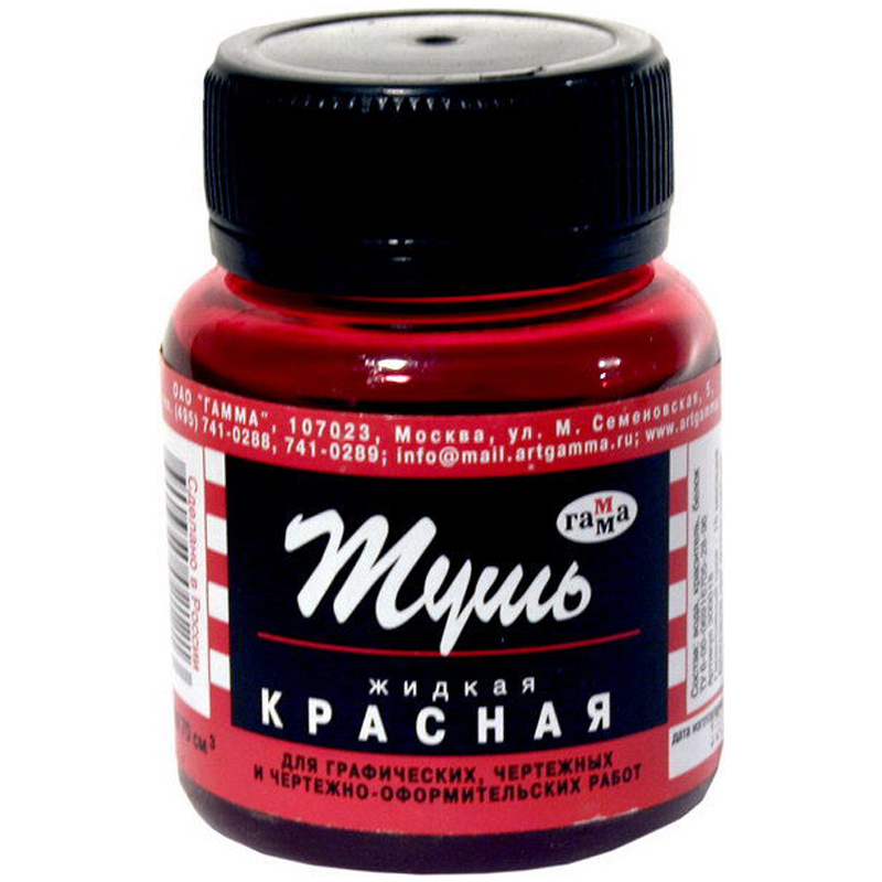 Тушь «ГАММА» для графических, чертёжных, чертёжно-оформительских работ и каллиграфии. Объём: 70 мл. Сочетает яркость цветов и чёткость линий. Оптимальная вязкость, лёгкость и удобство набора туши на рапидограф или рейсфедер. Устойчива к действию воды – достаточно промокнуть чертёж и тушь не растечется. Выдерживает температуру до −25°C.