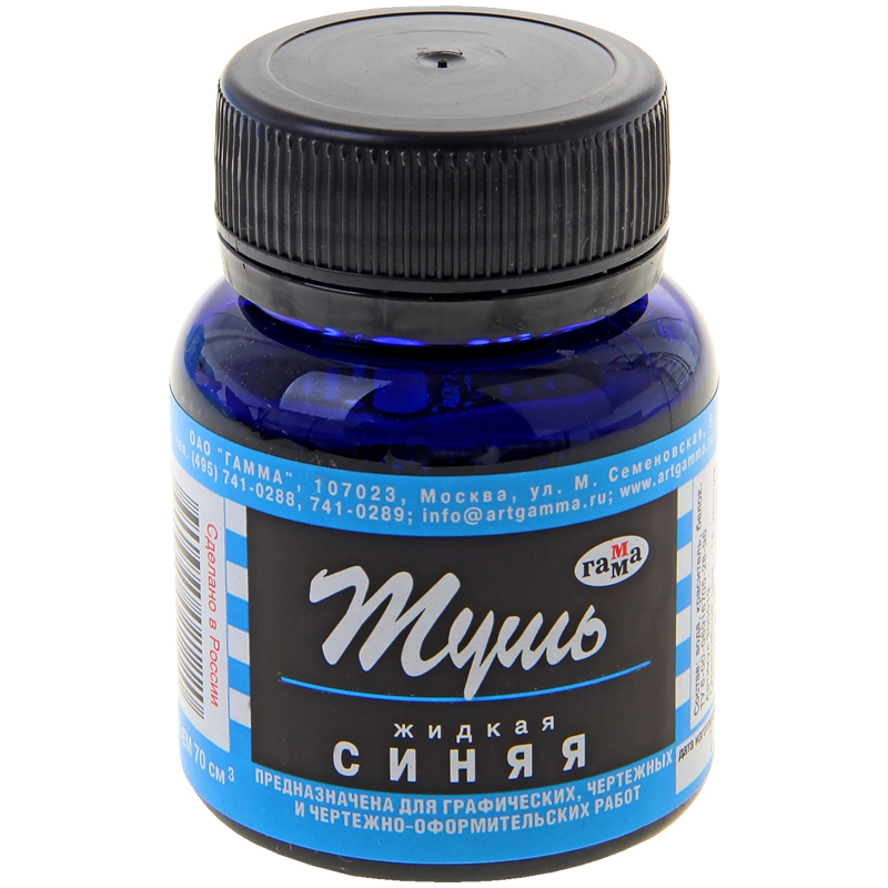 Тушь «ГАММА» для графических, чертёжных, чертёжно-оформительских работ и каллиграфии. Объём: 70 мл. Сочетает яркость цветов и чёткость линий. Оптимальная вязкость, лёгкость и удобство набора туши на рапидограф или рейсфедер. Устойчива к действию воды – достаточно промокнуть чертёж и тушь не растечется. Выдерживает температуру до −25°C.