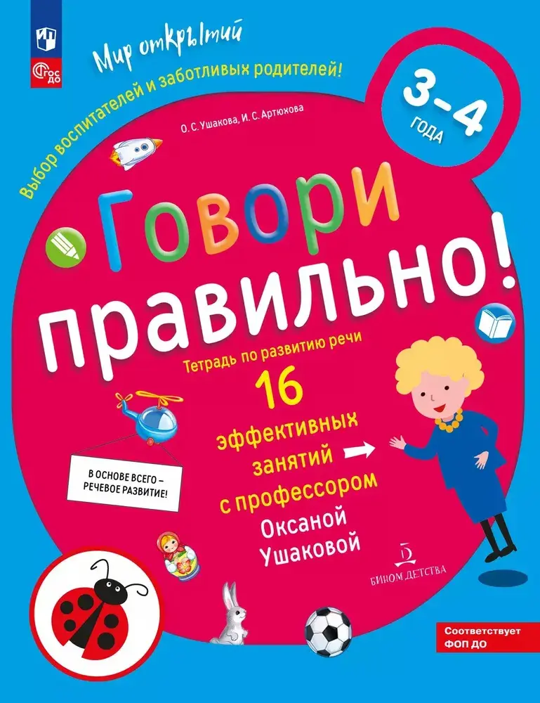 В тетрадь включены развивающие задания разного типа: загадки, игры со словами, игровые задания и упражнения, а также произведения фольклора – народные сказки, потешки, загадки. Такие задания помогут вам научить ребёнка правильно строить высказывания, употреблять предлоги, склонять слова по падежам, расширят словарный запас. Тетрадь построена на познавательном материале, который является интересным и увлекательным для детей этого возраста. Тетрадь доктора педагогических наук, профессора О. С. Ушаковой входит в комплект, реализующий образовательную программу дошкольного образования Мир открытий" (научный руководитель Л. Г. Петерсон) и предназначена для занятий в детском саду и дома с младшими дошкольникам – детьми 3-4 лет.
